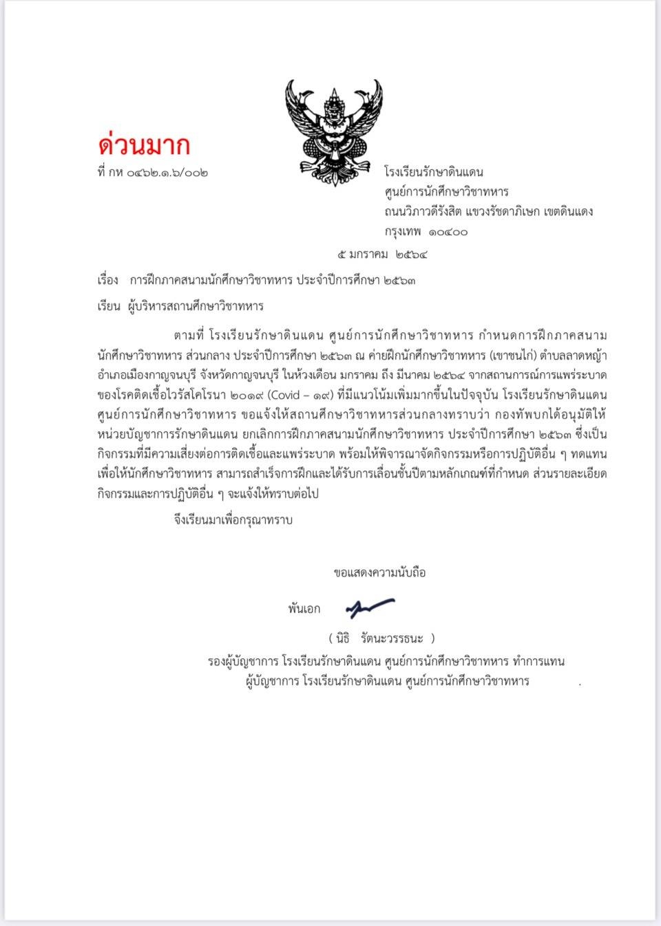 ยกเลิกการฝึกภาคสนามนักศึกษาวิชาทหาร ประจำปีการศึกษา ๒๕๖๓